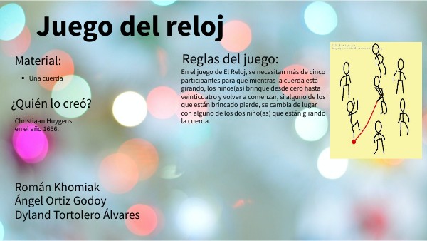En el juego de El Reloj, se necesitan más de cinco participantes para que mientras la cuerda está girando, los niños(as) brinque desde cero hasta veinticuatro y volver a comenzar, si alguno de los que están brincado pierde, se cambia de lugar con alguno de los dos niño(as) que están girando la cuerda.