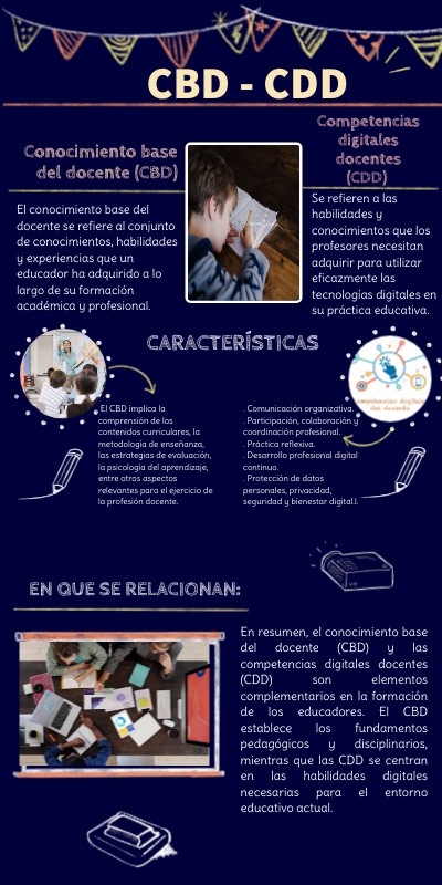 En resumen, el conocimiento base del docente (CBD) y las competencias digitales docentes (CDD) son elementos complementarios en la formación de los educadores. El CBD establece los fundamentos pedagógicos y disciplinarios, mientras que las CDD se centran en las habilidades digitales necesarias para el entorno educativo actual.