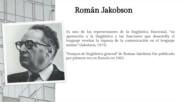 Es uno de los representantes de la lingüística funcional, “su aportación a la lingüística y las funciones que desarrolla el lenguaje revelan la riqueza de la comunicación en el lenguaje mismo” (Jakobson, 1975). "Ensayos de lingüística general" de Roman Jakobson fue publicado por primera vez en francés en 1963.