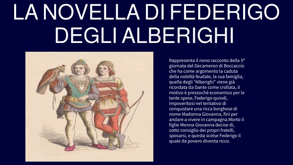 Rappresenta il nono racconto della 5ª giornata del Decameron di Boccaccio che ha come argomento la caduta della nobiltà feudale, la sua famiglia, quella degli "Alberighi" viene già ricordata da Dante come crollata, il motivo è pressoché economico per le tante spese, Federigo quindi, impoveritosi nel tentativo di conquistare una ricca borghese di nome Madonna Giovanna, finì per andare a vivere in campagna.Morto il figlio Monna Giovanna decise di, sotto consiglio dei propri fratelli, sposarsi, e questa scelse Federigo il quale da povero diventa ricco.