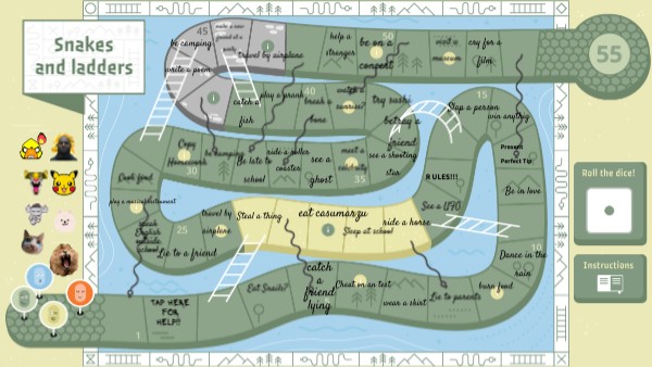 I giocatori iniziano con un gettone - che rappresenta ciascuno di loro - nella casella iniziale e, a turno, lanciano il dado. I gettoni si muovono secondo la numerazione sul tabellone, in ordine crescente. Se, alla fine di una mossa, un giocatore atterra su una casella dove inizia una scala, sale fino alla casella dove finisce. Se invece atterrano su una casella dove inizia la coda di un serpente, scendono fino alla casella dove termina la sua testa. Se un giocatore ottiene un 6, può muoversi due volte in un solo turno. Se un giocatore ottiene tre 6 consecutivi, deve rimanere fermo. Il giocatore che raggiunge la casella finale è il vincitore. Devi formulare la domanda con il suggerimento fornito, usando il Present Perfect ad esempio se finisci su una casella con "cry for film", devi dire "have you ever cried for a film? " e rispondi alla domanda. Se dici "Yes, I have", devi rispondere a un'altra domanda con il simple past da uno dei tuoi compagni di classe. Se è giusta, rimani su quella casella, altrimenti torni dove eri prima. Puoi chiedere un aiuto per rivedere regole o forme irregolari del verbo ma in quel caso andrai avanti una casella in meno