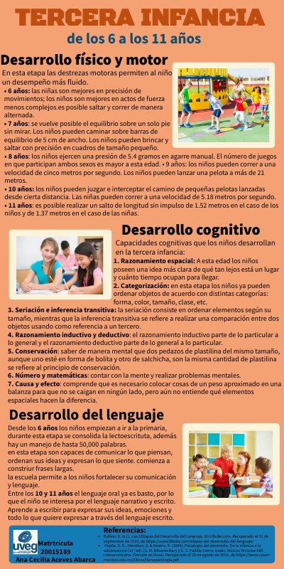 Desde los 6 años los niños empiezan a ir a la primaria, durante esta etapa se consolida la lectoescrituta, además hay un manejo de hasta 50,000 palabras. en esta etapa son capaces de comunicar lo que piensan, ordenan sus ideas y expresan lo que siente. comienza a constriur frases largas. la escuela permite a los niños fortalecer su comunicación y lenguaje. Entre los 10 y 11 años el lenguaje oral ya es basto, por lo que el niño se interesa por el lenguaje narrativo y escrito. Aprende a escribir para expresar sus ideas, emociones y todo lo que quiere expresar a través del lenguaje escrito.