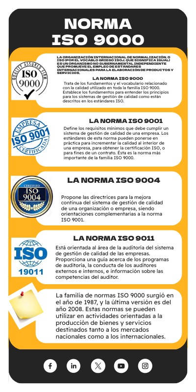 Define los requisitos mínimos que debe cumplir un sistema de gestión de calidad de una empresa. Los estándares de esta norma pueden ponerse en práctica para incrementar la calidad al interior de una empresa, para obtener la certificación ISO, o para fines de un contrato. Ésta es la norma más importante de la familia ISO 9000.