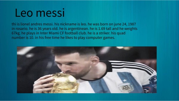 thi is lionel andres messi. his nickname is leo. he was born on june 24, 1987 in rosario. he is 36 years old. he is argentinean. he is 1.69 tall and he weights 67kg. he plays in Inter Miami CF football club. he is a striker. his quad number is 10. in his free time he likes to play computer games.
