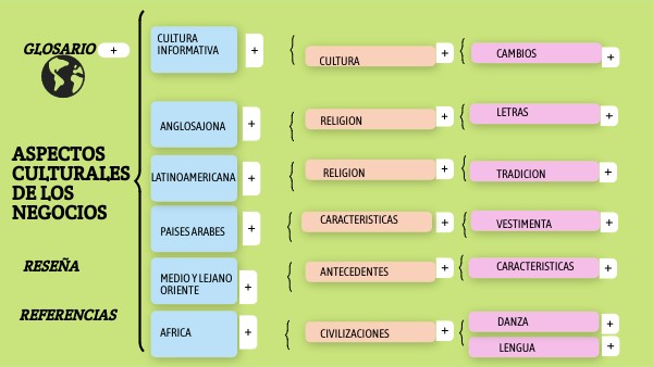 Equipo editorial, Etecé. (2024, 15 enero). Cultura de África: historia, religión, arte y características. Enciclopedia Humanidades. https://humanidades.com/cultura-de-africa/ Equipo editorial, Etecé. (2023b, enero 24). Cultura Oriental: regiones, historia y características. Enciclopedia Humanidades. https://humanidades.com/cultura-oriental/ Rodríguez, D. (2023, 12 junio). Países anglosajones. Lifeder. https://www.lifeder.com/paises-anglosajones/ Montano, J. (2019, 13 agosto). América Anglosajona: colonizadores, historia, cultura, clima. Lifeder. https://www.lifeder.com/america-anglosajona/ EcuRed. (s. f.). Cultura informacional - EcuRed. https://www.ecured.cu/Cultura_informacional Cultura árabe: historia, características, religión, economía, tradiciones (lifeder.com) Cruzito. (2022, 14 marzo). Cultura y tradiciones latinoamericanas ¿Qué es América Latina? | Estudyando. Estudyando. https://estudyando.com/cultura-y-tradiciones-latinoamericanas-que-es-america-latina/ ▷ Cultura árabe: curiosidades y tradiciones | italki - Aprende idiomas online con profesores particulares en italki. (s. f.). Italki. https://www.italki.com/es/blog/cultura-arabe