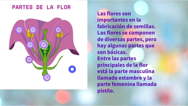 Las flores son importantes en la fabricación de semillas. Las flores se componen de diversas partes, pero hay algunas partes que son básicas. Entre las partes principales de la flor está la parte masculina llamada estambre y la parte femenina llamada pistilo.