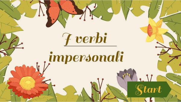 Ciao, sono Verbina, ho tanti amici e sono molto legata alla mia nonna. Amo andarla a trovare nella sua casa di campagna, ha un gran giardino dove gioco sempre con le mie amiche. Stiamo organizzando una festa; lei è bravissima a preparare dolci, sono buonissimi! Ma non amo le faccende domestiche, quindi lei mi fa sempre delle domandine e se non rispondo bene almeno a 4 di queste mi tocca aiutarla in cucina! Ho bisogno del tuo aiuto! La risposta esatta contiene sempre un verbo impersonale, ho timore di non ricordarli...Aiutami!