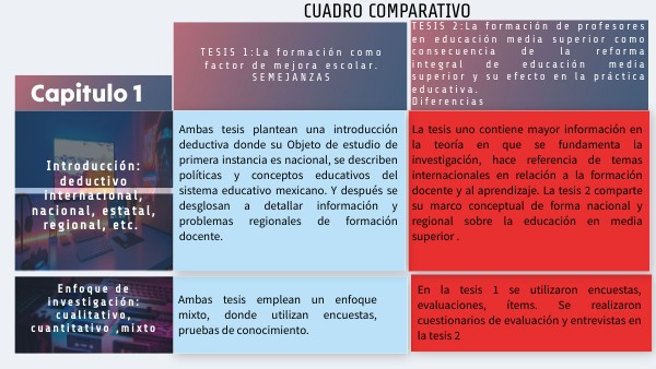 La tesis uno contiene mayor información en la teoría en que se fundamenta la investigación, hace referencia de temas internacionales en relación a la formación docente y al aprendizaje. La tesis 2 comparte su marco conceptual de forma nacional y regional sobre la educación en media superior .