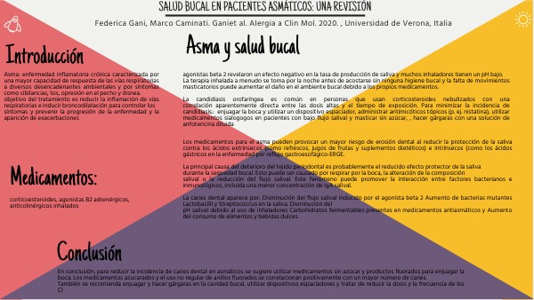 En conclusión, para reducir la incidencia de caries dental en asmáticos se sugiere utilizar medicamentos sin azúcar y productos fluorados para enjuagar la boca. Los medicamentos azucarados y el uso no regular de anillos fluorados se correlacionan positivamente con un mayor número de caries.También se recomienda enjuagar y hacer gárgaras en la cavidad bucal, utilizar dispositivos espaciadores y tratar de reducir la dosis y la frecuencia de los CI