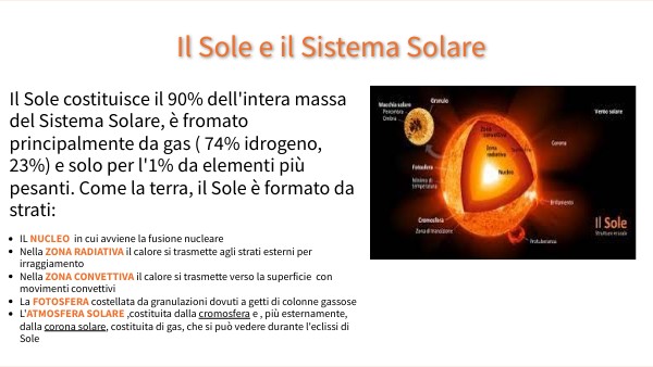 Il Sole costituisce il 90% dell'intera massa del Sistema Solare, è fromato principalmente da gas ( 74% idrogeno, 23%) e solo per l'1% da elementi più pesanti. Come la terra, il Sole è formato da strati: