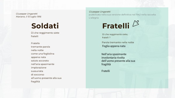 Nell’aria spasimante: l'aria è carica di tensione, perché non si sa cosa potrebbe accadere ai soldati. Involontaria rivolta: è un'anastrofe (viene invertito il normale ordine delle parole. si presenta prima l'aggettivo e poi il nome). Anche nel contesto di morte come quello della guerra, per è istintivo per l'uomo rivolgersi agli altri uomini chiamandoli fratelli. Il poeta sottolinea il senso di umanità e di fratellanza che non abbandona mai l'essere umano, anche nei contesti di morte; gli uomini si sentono vicini e uniti nel loro essere fratelli e quindi, ancora di più in guerra, fragili. Enjambement = “tremante/nella notte” (vv. 3-4); “rivolta / dell’uomo” (vv. 7-8), “alla sua/fragilità” (vv. 8-9)". Enjambemente è quando il poeta divide in su due versi diversi parole che dovrebbero stare vicine; per esempio dell’uomo presente alla sua f ragilità sua e fragilità dovrebbero essere sulla stessa riga (aggettivo e nome), però il poeta decide di dividerla per: -questione di metrica: il poeta deve rispettare delle regole precise nel conteggio delle sillabe -il poeta tramite questa poesia "crea" silenzio attorno alle parole importanti. dopo la parola sua, il lettore è costretto a fare silenzio perchè va a capo e questo dà importanza alla parola fragilità. - uso di allitterazioni: f,t,r che ricordano il suono del fruscio delle foglie, delle mitragliatrici e delle bombe.