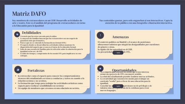 Soy monitora de extraescolares en un CEIP. Desarrollo actividades de arte y teatro. Este es el análisis del programa de extraesxolares en torno a la Educauión para la Igualdad