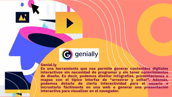Genial.ly Es una herramienta que nos permite generar contenidos digitales interactivos sin necesidad de programar y sin tener conocimientos de diseño. Es decir, podemos diseñar infografías, presentaciones o mapas con el típico interfaz de “arrastrar y soltar”. Además, podemos dotarlo de cierta interactividad para el usuario e incrustarlo fácilmente en una web o generar una presentación interactiva para visualizar en el navegador.