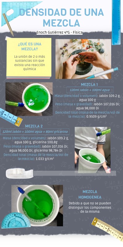 Masa (dencidad x volumen): Jabón 109.2 g, agua 100 g, glicerina 100.8g Peso (masa x gravedad): Jabón 107,016 Di; agua 98,000 Di; glicerina 98,784 Di Dencidad total (masa de la mezcla/vol de la mezcla): 1.033 g/cm3