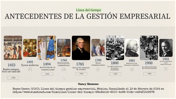 Reyes Oscar. (2020). Linea del tiempo gestion empresarial. México. Consultado el 19 de febrero de 2024 en https://www.timetoast.com/timelines/linea-del-tiempo-88ed4c1d-6500-4c98-b0dc-c494f1529978