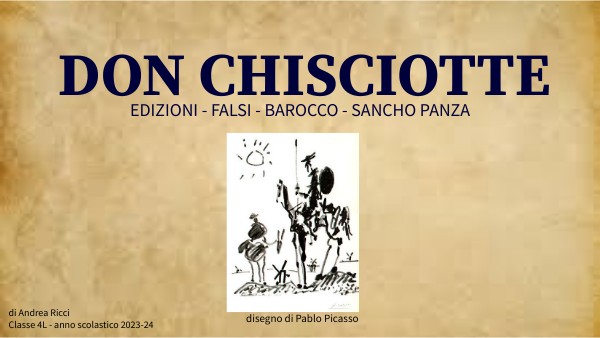 - Narra la storia di un hidalgo (Don Chisciotte) che, dopo aver letto troppi poemi cavallereschi, decide di diventare un cavaliere errante, iniziando così una serie di avventure, accompagnato da un contadino/scudiero (Sancho Panza) e dal suo cavallo (Ronzinante)