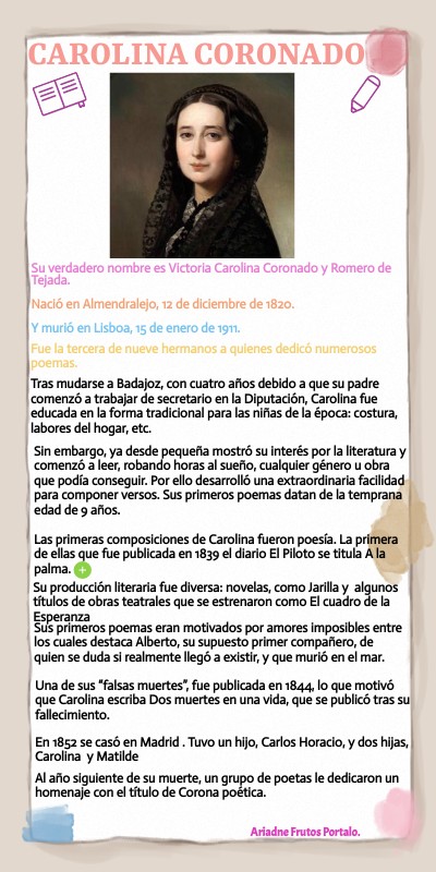Su verdadero nombre es Victoria Carolina Coronado y Romero de Tejada.Nació en Almendralejo, 12 de diciembre de 1820. Y murió en Lisboa, 15 de enero de 1911.