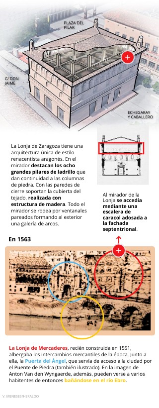 La Lonja de Zaragoza tiene una arquitectura única de estilo renacentista aragonés. En el mirador destacan los ocho grandes pilares de ladrillo que dan continuidad a las columnas de piedra. Con las paredes de cierre soportan la cubierta del tejado, realizada con estructura de madera. Todo el mirador se rodea por ventanales pareados formando al exterior una galería de arcos.
