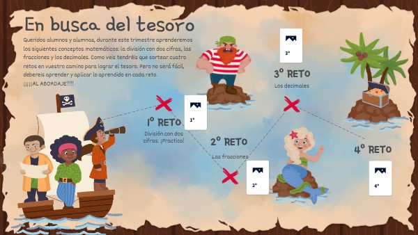 Queridos alumnos y alumnas, durante este trimestre aprenderemos los siguientes conceptos matemáticos: la división con dos cifras, las fracciones y los decimales. Como veis tendréis que sortear cuatro retos en vuestro camino para lograr el tesoro. Pero no será fácil, debereis aprender y aplicar lo aprendido en cada reto. ¡¡¡¡¡AL ABORDAJE!!!!!