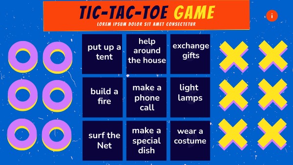 It is always played between 2 players. Each player chooses a shape (O or X). At each turn each player places one of his pieces. The player who manages to place 3 pieces in a row in a horizontal, vertical or diagonal line wins the game. Once all the available spaces are filled, if nobody manages to place 3 pieces in a row, the game ends in a draw.