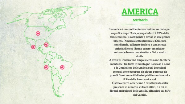 L'america è un continente vastissimo, secondo per superfice dopo l'Asia, occupa infatti il 28% delle terre emerese. Il continente è diviso in due grandi blocchi: l'America settentrionale e l'America meridionale, collegate fra loro a una stretta striscia di terra l'istmo centro-americano. entrambe hanno una struttura fisica molto simile. A ovest si innalza una lunga successione di catene montuose: fra tutte le montagne Rocciose a nord e la Cordigliera delle Ande a sud. Le regioni centrali sono occupate da piaure percorse da grandi fiumi come il Mississipi-Missouri a nord e il Rio delle Amazzoni a sud. L'istmo centro-americano è caratterizato dalla presenza di numrosi vulcani attivi, e a est d diversi arcipelaghi delle Antille, affacciati sul MAr dei Caraibi.