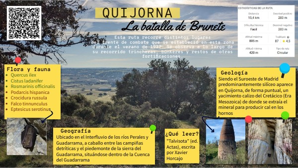 Esta ruta recorre distintos lugares del frente de combate que se estableció en esta zona durante el verano de 1937. Se observa a lo largo de su recorrido trincheras, búnkeres y restos de otras fortificaciones.
