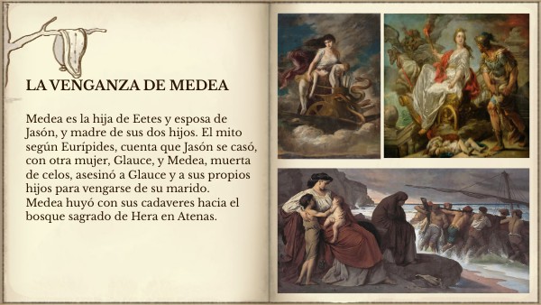 Medea es la hija de Eetes y esposa de Jasón, y madre de sus dos hijos. El mito según Eurípides, cuenta que Jasón se casó, con otra mujer, Glauce, y Medea, muerta de celos, asesinó a Glauce y a sus propios hijos para vengarse de su marido. Medea huyó con sus cadaveres hacia el bosque sagrado de Hera en Atenas.