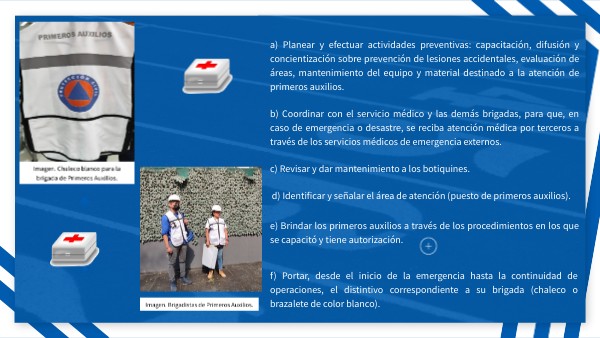 a) Planear y efectuar actividades preventivas: capacitación, difusión y concientización sobre prevención de lesiones accidentales, evaluación de áreas, mantenimiento del equipo y material destinado a la atención de primeros auxilios.