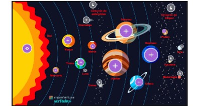 El cinturón de Kuiper es un anillo de cuerpos helados situado fuera de la órbita de Neptuno. Plutón es el elemento más famoso del cinturón de Kuiper. El Sol está en el centro de nuestro sistema solar. Está orbitado por ocho planetas: Mercurio, Venus, la Tierra, Marte, Júpiter, Saturno, Urano y Neptuno.