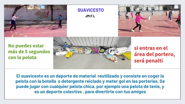 El suavicesto es un deporte de material reutilizado y consiste en coger la pelota con la botella o detergente reiclado y meter gol en las porterias. Se puede jugar con cualquier pelota chica, por ejemplo una pelota de tenis, y es un deporte colectivo , para divertirte con tus amigos