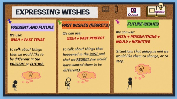 We can use: WISH + PAST PERFECT to talk about things that happened in the PAST and that we REGRET (we would have wanted them to be different).