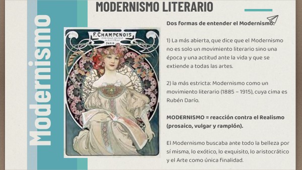 Dos formas de entender el Modernismo:1) La más abierta, que dice que el Modernismo no es solo un movimiento literario sino una época y una actitud ante la vida y que se extiende a todas las artes.2) la más estricta: Modernismo como un movimiento literario (1885 – 1915), cuya cima es Rubén Darío. MODERNISMO = reacción contra el Realismo (prosaico, vulgar y ramplón).El Modernismo buscaba ante todo la belleza por sí misma, lo exótico, lo exquisito, lo aristocrático y el Arte como única finalidad.