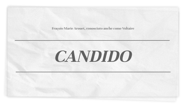 Crede nel concetto del miglior mondo possibile e che tutto ciò che accade è per il meglio e che il tutto è governato da un’entità benevola. Questo concetto gli è stato insegnato dal suo precettore Pangloss. Candido presto viene coinvolto in una serie di avventure che mettono alla prova il suo ottimismo: viene cacciato dal castello in cui ha vissuto per colpa dell’amore che prova per Cunegonda, figlia del barone, così si ritrova coinvolto in una serie di disastri, come essere arruolato nell’esercito bulgaro, assistere ad un terremoto a Lisbona e sperimentare la crudeltà e l’ingiustizia umana sotto molte forme. Incontrerà una serie di personaggi, ognuno dei quali rappresenta una diversa sfaccettatura della società e della natura umana. Alla fine del romanzo farà un viaggio di crescita personale e filosofica, dopo aver rincontrato Pangloss. Metterà in discussione le sue più radicate convinzioni per concludere che l’importante è vivere una vita nel miglior modo possibile nel presente, coltivando il proprio giardino piuttosto che cercare delle risposte a questioni filosofiche.
