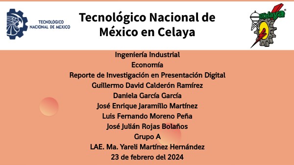 Ingeniería Industrial Economía Reporte de Investigación en Presentación Digital Guillermo David Calderón Ramírez Daniela García García José Enrique Jaramillo Martínez Luis Fernando Moreno Peña José Julián Rojas Bolaños Grupo A LAE. Ma. Yareli Martínez Hernández 23 de febrero del 2024