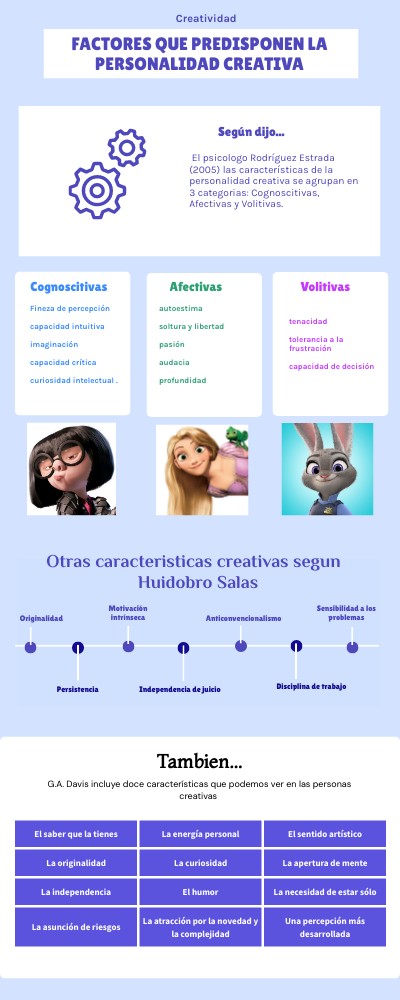 El psicologo Rodríguez Estrada (2005) las características de la personalidad creativa se agrupan en 3 categorias: Cognoscitivas, Afectivas y Volitivas.