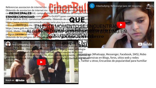Referencias asosiacion de internet mx . (s.f.). asosiacion de internet mx . Obtenido de asosiacion de internet mx : https://www.asociaciondeinternet.mx/ campus virtual intec. (2018). campus virtual intec. Obtenido de campus virtual intec: https://www.youtube.com/watch?v=Ds3GP7ypzes commonsensemedia. (18 de abril de 2019). commonsensemedia. Obtenido de commonsensemedia: https://www.commonsensemedia.org/es/articulos/que-es-el-ciberbullying-y-como-prevenirlo gob.mx. (5 de agosto de 2016). gob.mx. Obtenido de gob.mx: https://www.gob.mx/ciberbullying/articulos/que-es-el-ciberbullying lifeder. (2024). lifeder. Obtenido de lifeder: https://www.lifeder.com/ciberbullying/ los peligros del internet en niños . (2018). los peligros del internet en niños . Obtenido de los peligros del internet en niños : https://www.youtube.com/watch?v=i_92-NovRT0 movistar ciberbulling . (2019). movistar ciberbulling . Obtenido de movistar ciberbulling : https://www.youtube.com/watch?v=PNFiYVsost4 psicologia online . (2021). psicologia online . Obtenido de psicologia online : https://www.psicologia-online.com/que-es-el-ciberbullying-causas-y-consecuencias-4438.html psicologia y mente. (3 de diciembre de 2016). psicologia y mente . Obtenido de psicologia y mente: https://psicologiaymente.com/social/ciberbullying-acoso-virtual