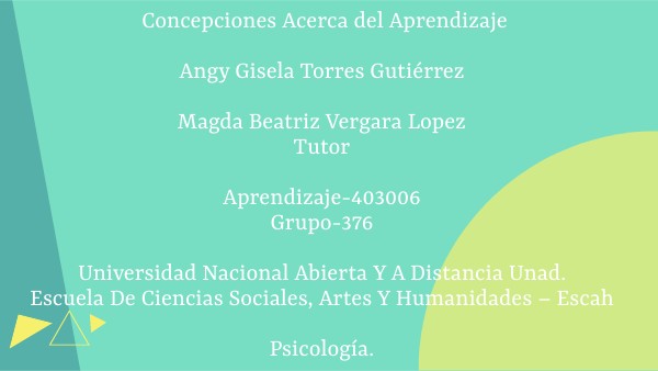 Concepciones Acerca del Aprendizaje Angy Gisela Torres Gutiérrez Magda Beatriz Vergara Lopez Tutor Aprendizaje-403006 Grupo-376 Universidad Nacional Abierta Y A Distancia Unad. Escuela De Ciencias Sociales, Artes Y Humanidades – Escah Psicología.