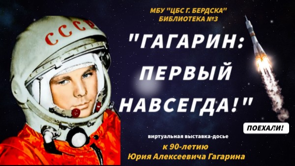 Гагарин : первый навсегда : выставка-досье к 90-летию Юрия Гагарина : 12+ / [сост. М. Л. Балобина ; оформ. М. Л. Балобина] ; МБУ «Централизованная Библиотечная Система г. Бердска», библиотека №3. – Бердск, 2024. - Текст. Изображение : электронные // Genial.ly. : [облачный сервис]. – URL: https://view.genially.com/65d450b7afe0580014782484/presentation-gagarin-pervyj-navsegda (дата обращения: 28.08.2024). - Режим доступа: Сайт МБУ «ЦБС» г. Бердска, Раздел «О библиотеке. Структура библиотек ЦБС. Библиотека №3», подраздел «Виртуальные выставки»