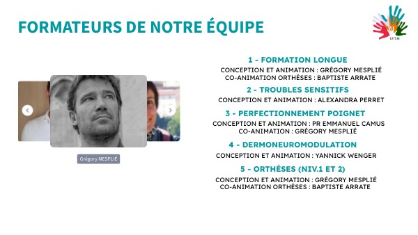 - Cours avancés système sensitif et lésions axonales Centre de rééducation ROCHEPLANE Grenoble 2020 - Cours système sensitif et lésions axonales Enseignante vacataire 4 promotions de kinésithérapie, ergothérapie - Faculté de médecine Rockefeller Lyon Depuis 2020 - Organisation formation rééducation des douleurs neuropathiques Niveau 1 à Grenoble 2018 - SDRC, actualité - Colloques GRAMM Lyon 2018 - Cours prise en charge des cicatrices - DIU Rééducation et appareillage de la main, Université Joseph Fourier, Grenoble 1 Depuis 2018 - Cours système sensitif et lésions axonales - DIU Rééducation et appareillage de la main, Université Joseph Fourier, Grenoble 1 + interventions appareillage Depuis 2016 - SDRC, État de l’art. GEMMSOR, Paris 2017 - Le SDRC, prise en charge sensitive - Colloque HEH à Lyon Février 2016 - Rééducation de la main et du membre supérieur avec formation appareillage - Douala Cameroun 2015-2019 - Mission humanitaire Cameroun - Congrès GEMMSOR, Paris Décembre 2015 - Main et préhension chez le chimpanzé - Congrès du GEMMSOR, Paris Décembre