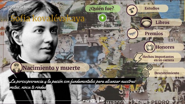 -En el VI Congreso de Médicos y Naturalistas en Moscú, Sofia Kovalivskaia conoció a Gösta Mittg-Leffer de la Universidad de Estocolmo, mucho más abierta a las mujeres, que le propuso un puesto como profesora. Desde su primera clase tuvo un éxito total. -Nació en una familia rica y noble en la que estuvo en contacto con la cultura científica y era descendiente de científicos de origen alemán y uno de sus tíos le transmitió su entusiasmo por las ciencias