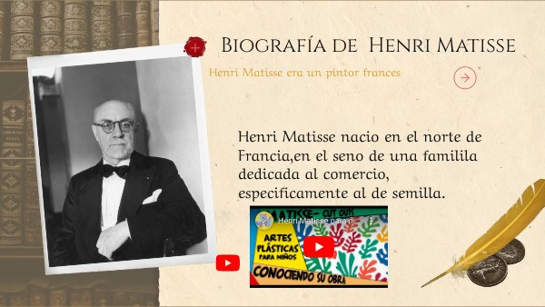 Henri Matisse era un gran pintor frances que nacio al norte de francia . En 1887 se mudo a Paris para poder estudiar las leyes y a la vez trabajaba como administrativo .Y en 1889 comenzo a pintar , cuando convaleciente de una apendicitis de su madre le llevo a pintary desde ese momento descubrio el paraiso.Y apartir dedes entonces decidio convertirse en artista plastico, a pesar que esto desepciono profundamente a su padre. En País fue a curo de pintura con grades pintores y en 1892 ingreso en otra escuela de pintura , donde recibio clases en el taller del pintor simbolista.Donde coincidio con otros grandes artistas
