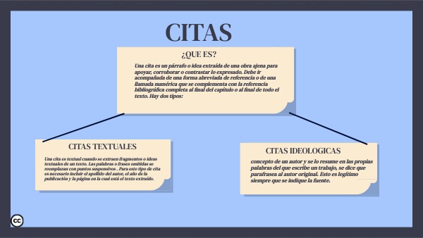 Una cita es un párrafo o idea extraída de una obra ajena para apoyar, corroborar o contrastar lo expresado. Debe ir acompañada de una forma abreviada de referencia o de una llamada numérica que se complementa con la referencia bibliográfica completa al final del capítulo o al final de todo el texto. Hay dos tipos: