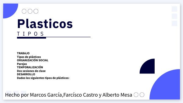 TRABAJO Tipos de plásticos ORGANIZACIÓN SOCIAL Grupos TEMPORALIZACIÓN Cuatro sesiones de clase DESARROLLO Tipos de plásticos y su desarrollo
