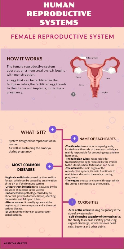-The Ovaries:two almond-shaped glands, located on either side of the uterus, which are mainly responsible for producing eggs and sex hormones, -The fallopian tubes: responsible for transporting the eggs released by the ovaries to the uterus, where fertilization can ocure -The uterus:the main organ of the reproductive system, its main function is to maintain and nourish the embryo during pregnancy. -The vagina :muscular channel through which the uterus is connected to the outside,