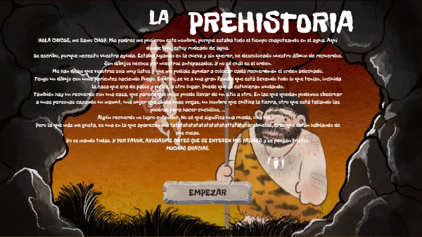 HOLA CHICOS, me llamo CHOP. Mis padres me pusieron este nombre, porque estaba todo el tiempo chapoteando en el agua. Aquí donde vivo, estoy rodeado de agua. Os escribo, porque necesito vuestra ayuda. Estaba jugando en la cueva y sin querer, he descolocado nuestro álbum de recuerdos. Son dibujos hechos por nuestros antepasados. Y no sé cuál es el orden. Me han dicho que vosotros sois muy listos y que me podíais ayudar a colocar cada recuerdo en el orden adecuado. Tengo un dibujo con unos parientes haciendo fuego. En otro, se ve a una gran familia que está llevando todo lo que tenían, incluida la casa que era de palos y pieles, a otro lugar. Puede que se estuvieran mudando. También hay un recuerdo con una casa, que parece que no se puede llevar de un sitio a otro. En las que quedan podemos observar a unas personas cazando un mamut, una mujer que cuida unas ovejas, un hombre que cultiva la tierra, otro que está tallando las piedras para hacer cuchillos, … Algún recuerdo no logro entender. No sé qué significa una rueda, una vela,… Pero la que más me gusta, es una en la que aparecen mis tatatatatatatatatatatattatatatarabuelos, creo que están hablando de sus cosas. Yo os mando todas. Y POR FAVOR, AYUDADME ANTES QUE SE ENTEREN MIS PADRES y se pongan tristes. MUCHAS GRACIAS.