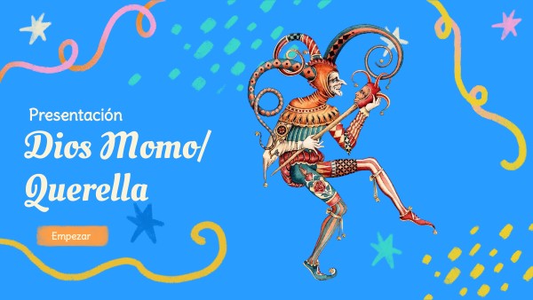 Hesiodo contaba que era hijo de Nix (la Noche) y Érebo (la Oscuridad), hermano gemelo de la miseria. Él era la personificación de la burla, el sarcasmo y la ironia. Siempre se decía que vestía con una máscara y con un muñeco o un cetro acabado en una cabeza grotesca en la mano, símbolo de la locura, y se le comparaba con un bufón o con el joker. Se le representaba como un joven risueño que disfrutaba de las travesuras y el buen humor.