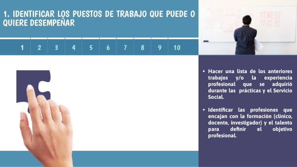 - Identificar las profesiones que encajan con la formación (clínico, docente, investigador) y el talento para definir el objetivo profesional.