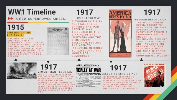 Although Initially neutral, the US entered the war after it was triggered by the sinking of the lusitania and the zimmerman telegram, feeling the need to intervene in order to 'safeguard the world for democracy'