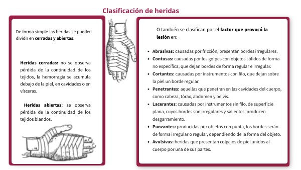 Heridas cerradas: no se observa pérdida de la continuidad de los tejidos, la hemorragia se acumula debajo de la piel, en cavidades o en vísceras. Heridas abiertas: se observa pérdida de la continuidad de los tejidos blandos.