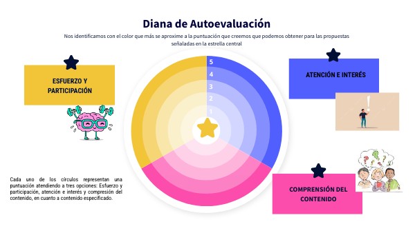 Queremos evaluar con esta Diana al alumnado de tercero de primaria en cuanto a sumas, restas y divisiones en la materia de matemáticas. Sería una evaluación global para todo el grupo, donde cada alumno tiene que evaluar su grado de adquisición de los contenidos, destrezas habilidades etc.. Se expondra en clase y se observará tras la evaluación el grado de adquisición. Se evaluarán en 3 aspectos: esfuerzo y participación, atención e interés y comprensión de los contenidos. Sumas y restas con llevadas y la división por una cifra. Dependiendo del grado de adquisición y evaluándonos por colores, nos aproximaremos aquel con el que nos encontremos más seguros. Este proceso nos ayudará a identificar el grado de adquisición de los contenidos aprendidos y aspectos a reforzar.